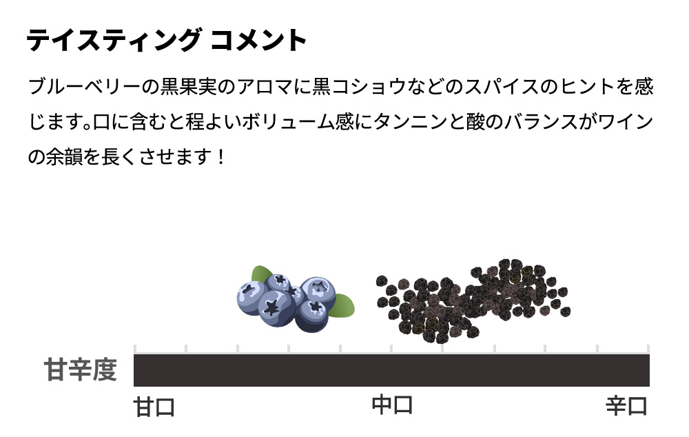 ブルーベリーの黒果実のアロマに黒コショウなどのスパイスのヒントを感じます。口に含むと程よいボリューム感にタンニンと酸のバランスがワインの余韻を長くさせます!自然派「ECOCERT認証」「ヴィーガン認証」の自然派ワインで、オーク樽熟成の本格派辛口赤ワイン!