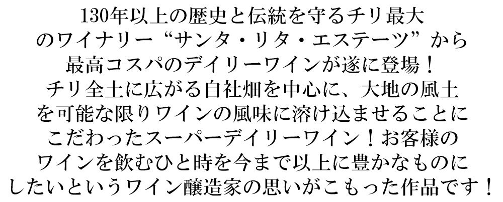 130年以上の歴史と伝統を守るチリ最大のワイナリー“サンタ・リタ・エステーツ”から最高コスパのデイリーワインが遂に登場!