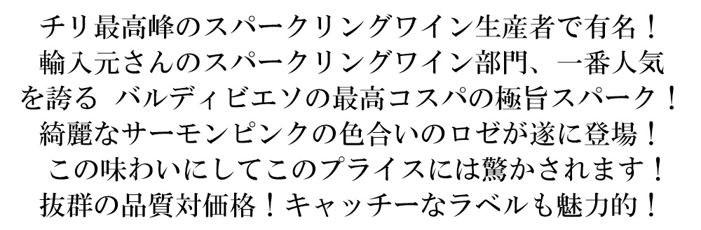 綺麗なサーモンピンクの色合い!チャーミングなアロマにストロベリーの果実味。引き締まった酸と細かな泡を持つ上質なロゼスパークリング!