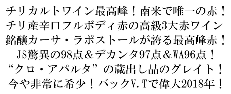 チリカルトワイン最高峰!チリ産辛口フルボディ赤ワインの高級3大赤ワイン(トッププレミアム)といわれる“クロ・アパルタ”の蔵出し品がついに入荷!