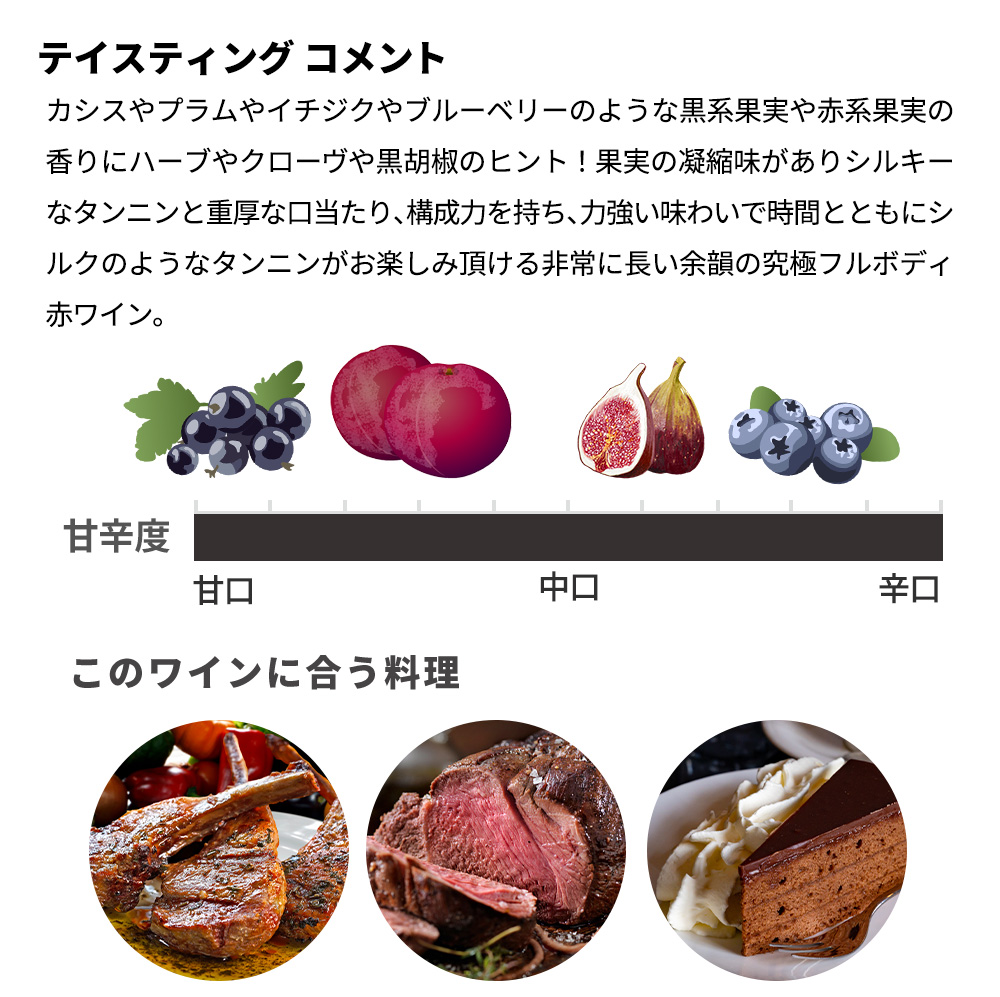 赤紫色に黒を帯びたインクのような濃い色合い!カシスやプラムやイチジクやブルーベリーのような黒系果実や赤系果実の香りにハーブやクローヴや黒胡椒のヒント!果実の凝縮味がありシルキーなタンニンと重厚な口当たり、構成力を持ち、力強い味わいで時間とともにシルクのようなタンニンがお楽しみ頂ける非常に長い余韻の究極フルボディ赤ワインが高評価ヴィンテージ[2018]年で限定少量入荷!