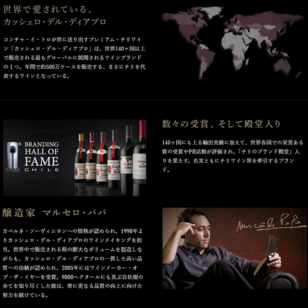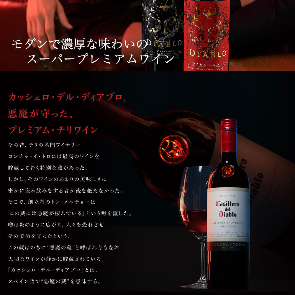 『ディアブロ(悪魔)』がモチーフのワイン。黄金色に輝くイエローの色調が魅力的で、マンゴーやパッションフルーツのアロマが際立ち、しっかりした骨格を感じられる濃厚な白ワインです。脂ののった魚介類やクリーミーなソースを使った料理との相性が抜群です。