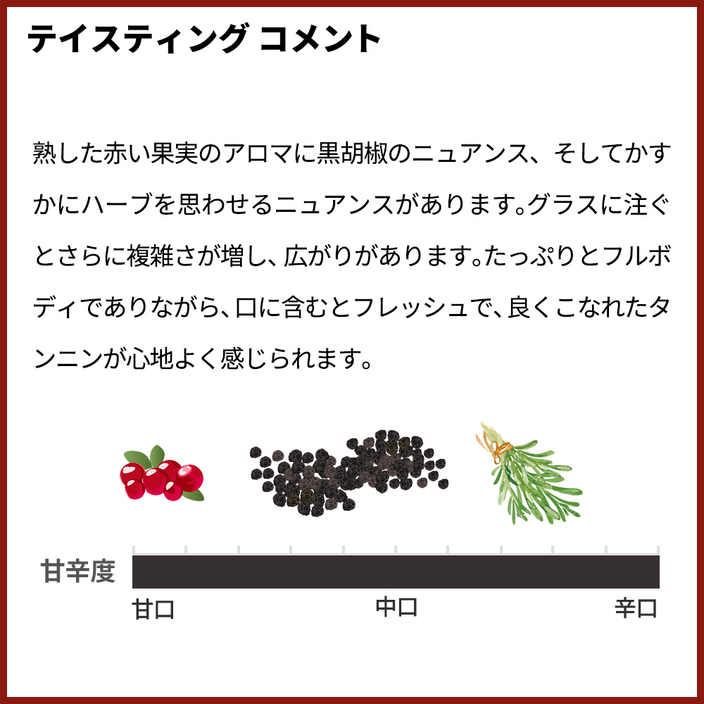 熟した赤い果実のアロマに黒胡椒のニュアンス、そしてかすかにハーブを思わせるニュアンスがあります。グラスに注ぐとさらに複雑さが増し、広がりがあります。たっぷりとフルボディでありながら、口に含むとフレッシュで、良くこなれたタンニンが心地よく感じられます。