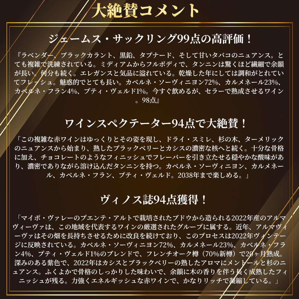 過去の「南米ベストワイナリー」に選ばれた究極ワイナリーの最高峰赤ワイン!2037年頃まで飲み頃が続くほど熟成ポテンシャルを持った複雑味とバランスの良さを兼ね備えた秀逸なヴィンテージ高評価連発の2022年!が限定で極少量入荷!