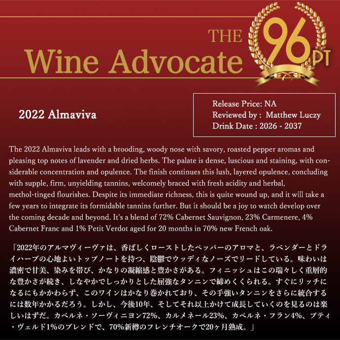 この2022年でジェームス・サックリングほぼ満点の驚異の99点獲得!絶賛コメントは『ラベンダー、ブラックカラント、黒鉛、タプナード、そして甘いタバコのニュアンス。とても複雑で洗練されている。ミディアムからフルボディで、タンニンは驚くほど繊細で余韻が長い。何分も続く。エレガンスと気品に溢れている。乾燥した年にしては調和がとれていてフレッシュ。魅惑的でとても長い。カベルネ・ソーヴィニヨン72%、カルメネール23%、カベルネ・フラン4%、プティ・ヴェルド1%。今すぐ飲めるが、セラーで熟成させるワイン。98点』!