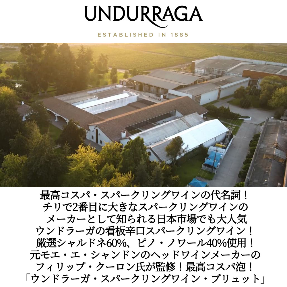 最高コスパ・スパークリングワインの代名詞!元モエ・エ・シャンドンのヘッドワインメーカー、フィリップ・クーロン氏が監修!スパークリング・ワインの生産は1950年代に始まり、今日では、伝統製法の中高級レンジをはじめ、プレミアムスパークリングメーカーとして、またチリで2番目に大きなスパークリングワインのメーカーとして知られる日本市場でも大人気ウンドラーガの柑橘系アロマが溢れ出す看板スパークリングワイン!
