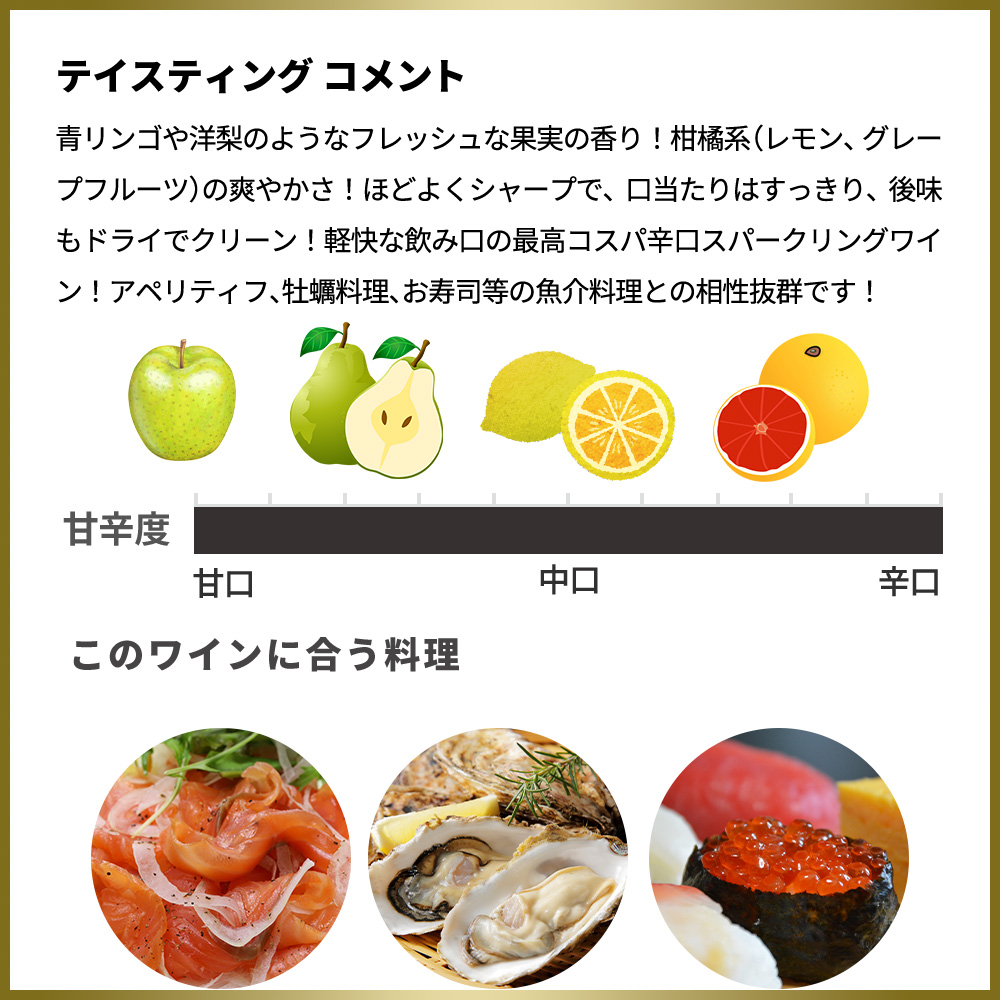 輝きのある淡い黄色!きめ細かく持続性のある泡!青リンゴや洋梨のようなフレッシュな果実の香り!柑橘系(レモン、グレープフルーツ)の爽やかさ!ほどよくシャープで、口当たりはすっきり、後味もドライでクリーン!軽快な飲み口の最高コスパ辛口スパークリングワイン!アペリティフ、牡蠣料理、お寿司等の魚介料理との相性抜群です!