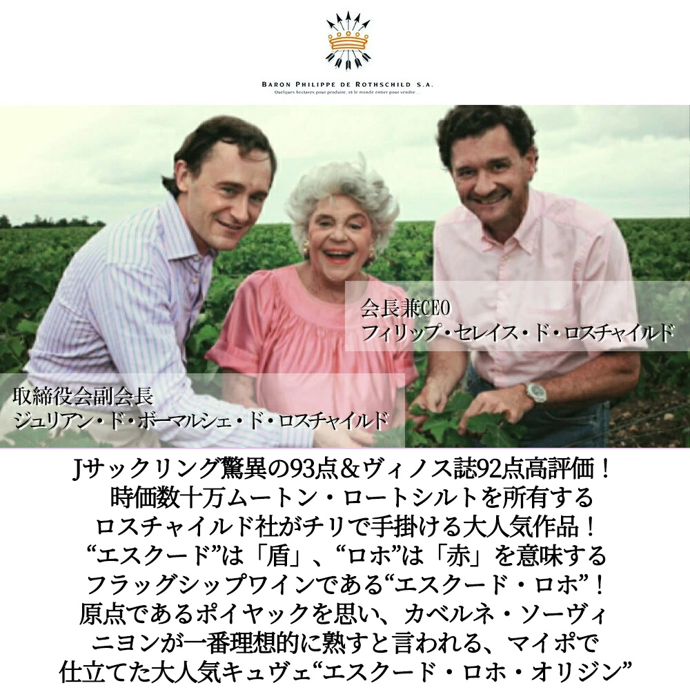 シャトー・ムートン・ロートシルトを所有するロスチャイルド社がチリで手掛ける大人気“エスクード・ロホ”!豊かな果実味としなやかな酸が印象的で、カベルネ・ソーヴィニヨンの魅力を余すことなく引き出したオリジン!