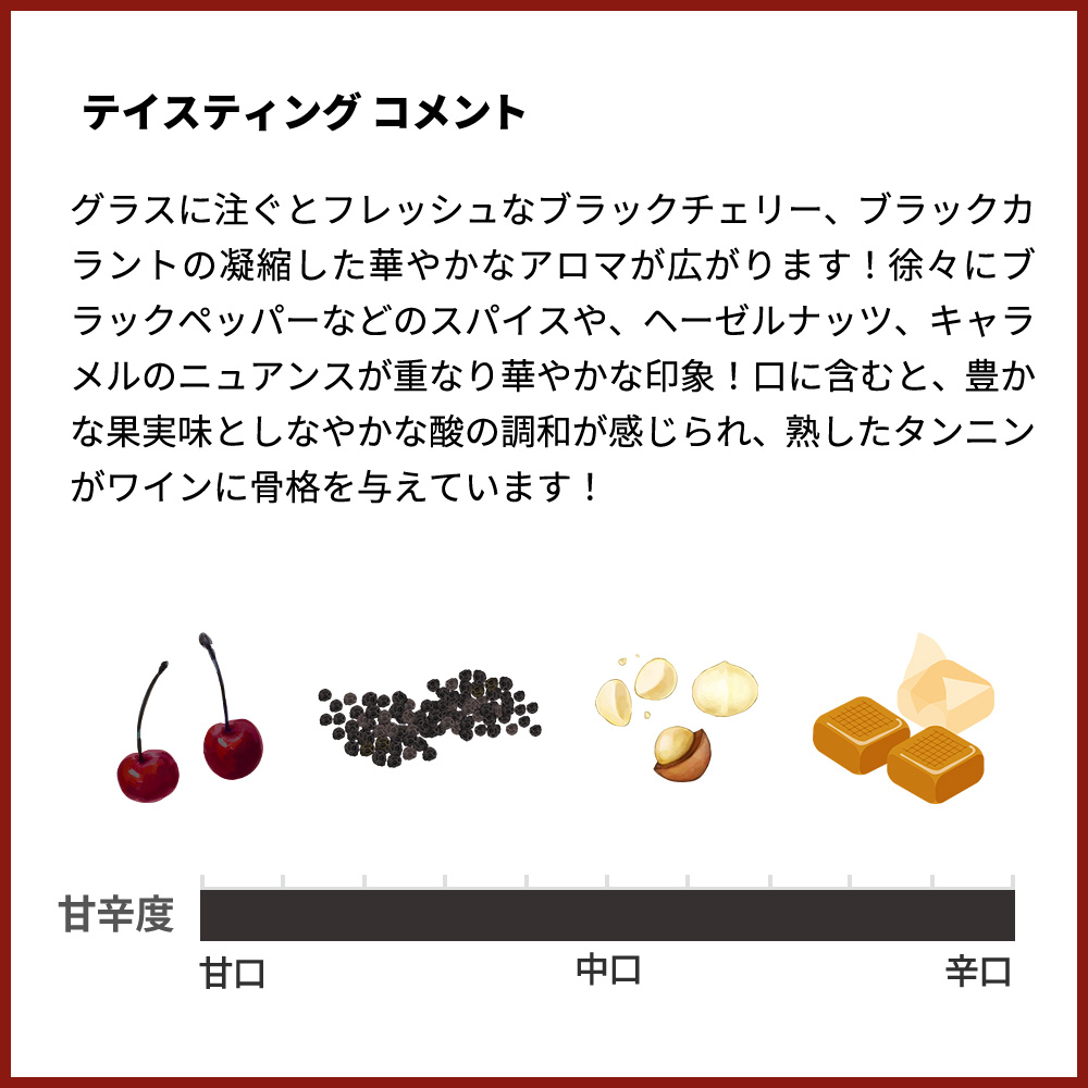 グラスに注ぐとフレッシュなブラックチェリー、ブラックカラントの凝縮した華やかなアロマが広がります!徐々にブラックペッパーなどのスパイスや、ヘーゼルナッツ、キャラメルのニュアンスが重なり華やかな印象!口に含むと、豊かな果実味としなやかな酸の調和が感じられ、熟したタンニンがワインに骨格を与えています!