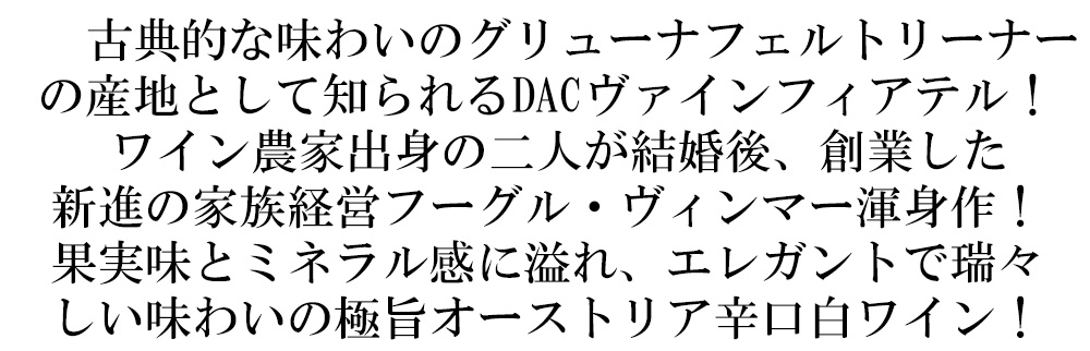 フーグル・グリューナー・フェルトリーナー・クラシック[2024]年・フーグル・ヴィンマー家元詰・ヴァインフィアテルDAC 首都ウィーンから北に60キロ程のところにある、ニーダーエースターライヒの古典的な味わいのグリューナフェルトリーナーの産地として知られるDACヴァインフィアテルから30代の若い夫婦による新進の家族経営ワイナリーによる白い花を想わせるフローラルな香り、柑橘系果実やグレープフルーツの心地良いアロマ!とトロピカルフルーツや品種由来の白コショウを想わせるスパイシーな印象!果実味とミネラル感に溢れ、エレガントで瑞々しい味わいのグレイト!の究極辛口白ワイン!