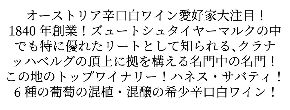 ハネス サバティ シュタイヤリッシェル メインサッツ 2019 ハネス サバティ家元詰 オーストリア 自然派 Nachhaltig Austria の認証取得 ■ぶどう品種:ヴェルシュリースリング種20%/ヴァイスブルグンダー種20%/ゲルバー・ムスカテラー種20%、ソーヴィニヨン・ブラン種15%/ショイレーベ種15%/シャルドネ種10% ■土壌:砂礫質・砂質土壌 造り手は、1840年創業!ズュートシュタイヤーマルクの中でも特に優れたリートとして知られる、クラナッハベルグの頂上に拠を構える名門中の名門!現当主ハネス・サバティで5代目のこの地のトップワイナリーのひとつ! ほとんどがオーストリア国内のレストランやワインショップや愛好家に直行! クラナッハベルグの水はけのよい砂礫や砂質からなる南向きの急斜面のテロワールから、他のどの産地でも感じることの出来ない鮮烈なミネラルが生まれます!そのミネラルをボトルに閉じ込めたのがこのワイン達! このワインは砂礫質・砂質土壌の4haの自社畑100%の6種のブドウを混植・混醸でステンレスタンクで発酵&熟成で造られる究極辛口白ワイン!
