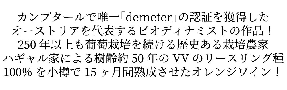 ハギャル マティアス リースリング ピュール オレンジワイン 2017 ハギャル マティアス家 自然派 デメテール認証&ユーロリーフ認証 ■ぶどう品種:リースリング種100% ■土壌:片麻岩土壌 ■栽培:自然派・ビオディナミ(デメテール認証)&ユーロリーフ認証 ■樹齢:約50年 ■発酵・熟成:50%をステンレスタンクで、50%を小樽で3週間マセラシオンさせた後、小樽で15ヶ月間熟成 ■SO2亜硫酸塩(二酸化硫黄=SO2):ビン詰め時にのみ極少量のSO2を使用 カンプタールで唯一「demeter」の認証を獲得したオーストリアを代表するビオディナミストの作品! ファルスタッフ誌やワインエンスージアスト誌、ベスト・オブ・ビオ誌大注目! 「モーツァルトやハプスブルグ家の遺産がオーストリア固有の文化であるように、歌舞伎や相撲が日本固有の文化であるように、私のワインは、オーストリアのカンプタールの固有の文化なのです。世界のいかなる他の産地のワインも、私のワインに似たものはありません。そしてそのようなワイン造りを可能にするのが、ビオディナミなのです。」とマティス氏!
