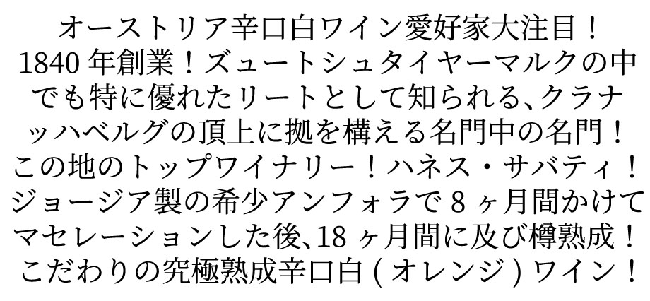 ハネス サバティ ソーヴィニヨン ブラン アンフォラ オレンジワイン 2013 蔵出し品 ハネス サバティ家元詰 自然派認証取得 白 辛口 ■ぶどう品種:ソーヴィニヨン・ブラン100% ■発酵・熟成:ジョージア製のアンフォラで8ヶ月間かけてマセレーション/18ヶ月間樽熟成(合計で9年熟成品) ■樹齢:平均30年 ■土壌:石灰質・砂礫質土壌 オーストリア・ソーヴィニヨン・ブラン種100%辛口白(オレンジワイン)ワイン愛好家大注目! 造り手は、1840年創業!ズュートシュタイヤーマルクの中でも特に優れたリートとして知られる、クラナッハベルグの頂上に拠を構える名門中の名門!現当主ハネス・サバティで5代目のこの地のトップワイナリーのひとつ! ほとんどがオーストリア国内のレストランやワインショップや愛好家に直行! クラナッハベルグの水はけのよい砂礫や砂質からなる南向きの急斜面のテロワールから、他のどの産地でも感じることの出来ない鮮烈なミネラルが生まれます!そのミネラルをボトルに閉じ込めたのがこのワイン達!