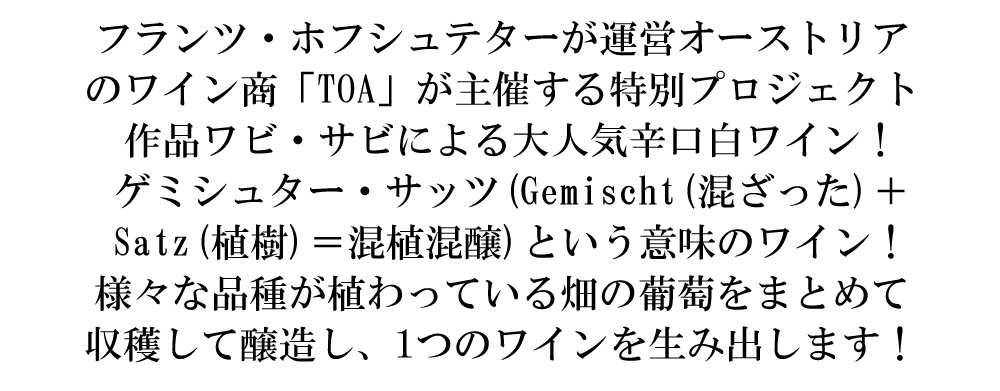 ワビ・サビ・ゲミシュター・サッツ・N.V・TOAフランツ・ホフシュテター・自然派ビオロジー栽培のグリューナー・ヴェルトリーナー70%&ソーヴィニヨン・ブラン20%&ゲルバー・ムスカテラー10%で造られるゲミシュター・サッツ ■ぶどう品種:グリューナー・ヴェルトリーナー70%、ソーヴィニヨン・ブラン20%、ゲルバー・ムスカテラー10% ■発酵・熟成:天然酵母のみで発酵/9ヶ月間シュール・リー熟成 ■平均樹齢:25年 ■土壌:花崗岩質・レス(黄土) ■収穫:手摘み100% オーストリア辛口白ワイン愛好家大注目!オーストリア最高峰産地からのゲミシュター・サッツ100%ファン大注目! ゲミシュター・サッツ(Gemischt(混ざった)+Satz(植樹)=混植混醸)を表します!様々な品種が植わっている畑のぶどうをまとめて収穫して醸造し、一つのワインを生み出します! この「ワビ・サビ」は、「TOA」のパートナーワイナリー各社の協力のもと、2015年にスタートしたプロジェクトで、ビオロジー栽培のぶどうから造られたオーストリアの自然派ワインを、広く世界に紹介することを目的としています! 「ワビ・サビ」は、EU各国、アメリカ、カナダ、シンガポールで展開されており、特にニューヨークをはじめとしてアメリカでは、自然派オーストリアワインの大ベストセラーに!