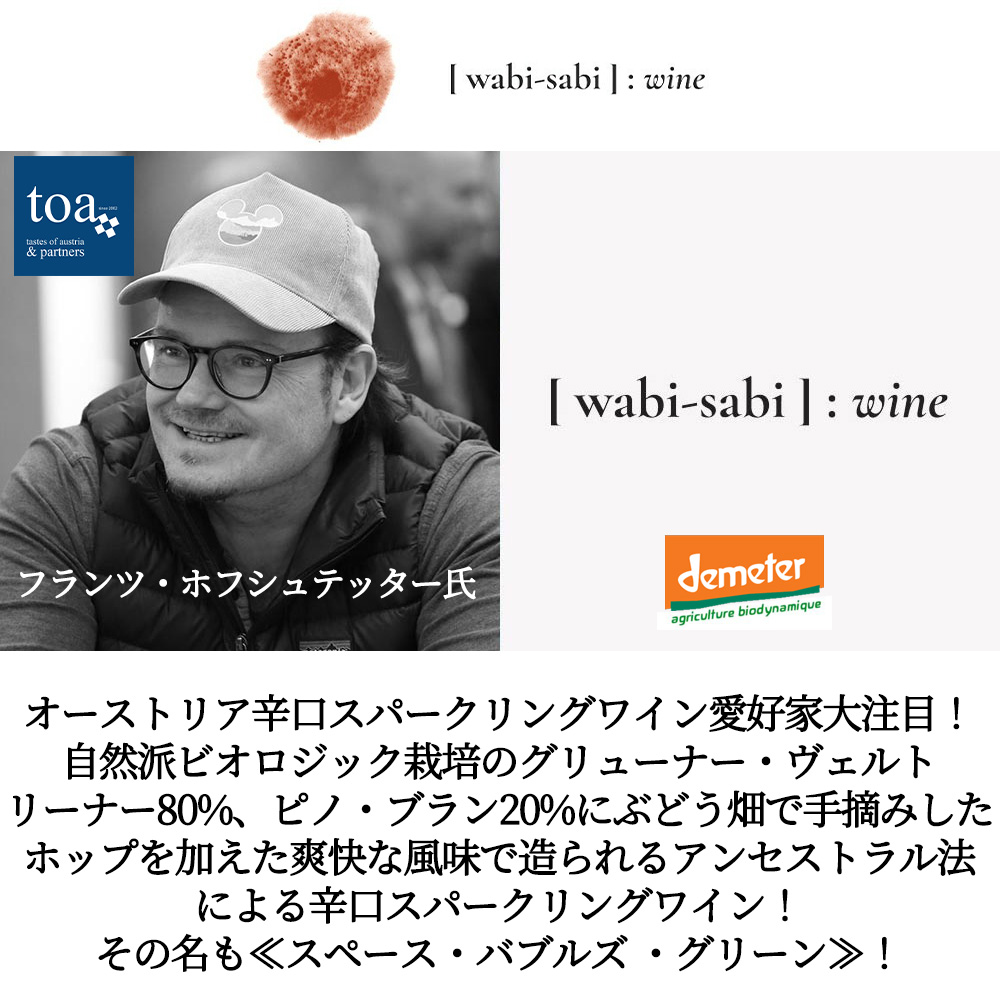 自然派ビオロジック栽培のグリューナー・ヴェルトリーナー80%、ピノ・ブラン20%にぶどう畑で手摘みしたホップを加えた爽快な風味で造られるアンセストラル法による辛口スパークリングワイン!その名も≪スペース・バブルズ ・グリーン≫!