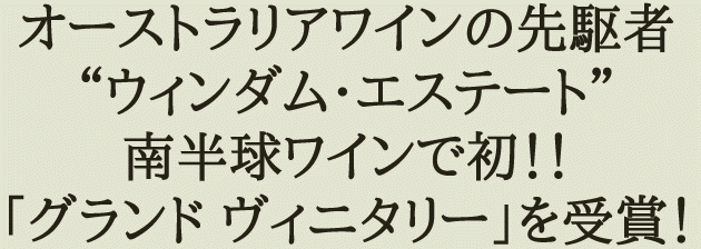 現存するオーストラリアで最も歴史の長いワイナリー「ウィンダム・エステート」が、最も権威のある国際ワインコンクール として名高い『2007 ヴィニタリー・インターナショナル・ワイン・コンペティション』 で、「グランド ヴィニタリー (最優秀ワイナリー賞)」の栄冠に輝きました。このたびの受賞は南半球のワインとしては初めての受賞で、これまで「ウィンダム・エステート」が目指してきた国際的なワイン賞を勝ち取ったことになります。『2007 ヴィニタリー・インターナショナル・ワイン・コンペティション』は、2007年3月21日‐25日の間、イタリアのヴェローナで開催されました。このコンクールは、世界最大規模で、もっとも権威のある国際ワインコンクールとして認知されており、今年は30カ国から3500以上のワインがエントリーされました。「グランド ヴィニタリー(最優秀ワイナーリー賞)」は、スティルワインとスパークリングワインをテーマごとにグループ分けし、それぞれのグループでメダルを受賞した2つのワインのトータルスコアが最も高いワイナリーに贈られる栄誉な賞です。各ワインは、世界中から集まった著名なエノロジストやシニアワインジャーナリストを含む21人の審査員によって審査され、今年はエントリーワイン全体の3%、わずか105のメダルのみが贈られました。その中で、「ウィンダム・エステート」は、「BIN555シラーズ2004」と「ショー・リザーブ カベルネ・メルロ2001」の2 つのワインが各グループで最高賞の「グランド ゴールド メダル(最優秀賞)」を受賞し、そのトータルスコアが最高点となりました。