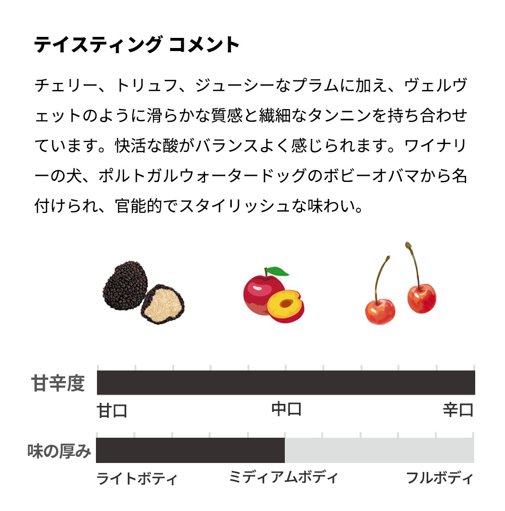 ボビー(ソーホー)・マールボロ・ピノ・ノワール[2022]年 ■葡萄品種:ピノ・ノワール100% マールボロ産の最良区画のピノ・ノワールを手摘み100%後、優しくプレスして樽詰め!フランス産の新樽と古樽を使用して造られる人気辛口赤ワイン!造り手は、ニュージーランドのワイン業界に40年以上携わる家族を持つレイチェル・カーターが2009年に設立! このピノ・ノワールは、層になって表れるチェリー、トリュフ、ジューシーなプラムに加え、ヴェルヴェットのように滑らかな質感と繊細なタンニンを持ち合わせています!快活な酸がバランスよく感じられます。 ワイナリーの犬、ポルトガルウォータードッグのボビーオバマから名付けられ、官能的でスタイリッシュな味わい!大人気ピノ・ノワールが限定少量入荷!