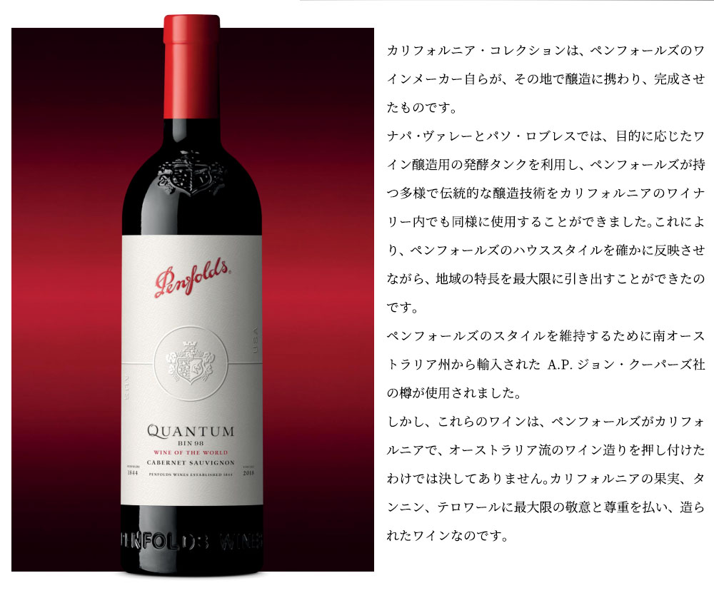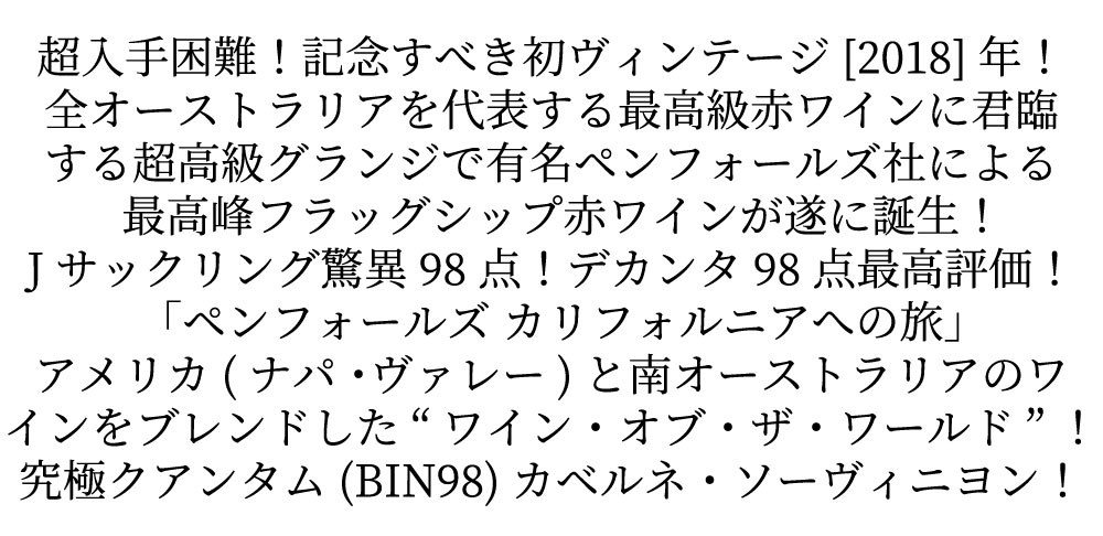 【箱入】ペンフォールズ クアンタム(BIN98)ワイン オブ ザ ワールド カベルネ ソーヴィニヨン 2018 ペンフォールズ社元詰 正規品 ■ぶどう品種:カベルネ・ソーヴィニヨン87% シラーズ13% ■発酵・熟成:アメリカンオーク樽(新樽80%)とフレンチオーク樽(新樽20%)で驚異の16ヶ月熟成 香り豊かな麦芽、濃厚な牛の骨髄、熟したベリー類など、はっきりとした香りの要素を持っています!ブラックベリー、ブルーベリー、ボイセンベリーなどの様々な黒系果実の香りの後に、砂糖をまぶしたペストリーや、シナモンとリンゴのパイのような香りも感じられます! 辛味の少ないホースラディッシュクリームや、ディジョンマスタードの風味がピリッとした香りの輪郭を与えています!ブルーベリーなどの青みがかったフルーツのフレーバーが口の中に広がり、粘性のあるテクスチャー、しなやかさ、ジューシーさを感じます。適度な酸味が口の中を引き締め、カベルネ・ソーヴィニヨンの特長である黒鉛、樽熟成由来のヘーゼルナッツの風味がワインを印象づけています。豊かな質感が口の中を包み、抜栓後、時間が経つと、甘さが増します。すべての要素を満たしたワインと言えるでしょう!