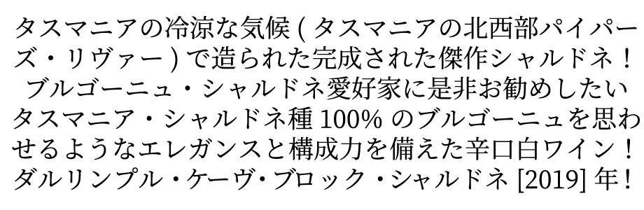 ダルリンプル ケーヴ ブロック シャルドネ タスマニア 2019 ダルリンプル 醸造家キャルドウェル氏 正規品 スクリューキャップ 白 辛口 ■ぶどう品種:シャルドネ100% ■発酵・熟成:フレンチオーク熟成 タスマニアの冷涼な気候(タスマニアの北西部パイパーズ・リヴァー)で造られた完成された傑作シャルドネ! ブドウはすべて手摘みで収穫後、選果を行い、完熟した果実のみを使用。 6つの異なる会社から購入した樽を組み合わせることで、目指す味わいを造り出しています! 提供温度は10度~14度!まさに「ヴィニュロン」が冷涼な地域で造るブルゴーニュタイプのシャルドネ種100%! ブルゴーニュ・シャルドネ愛好家に是非、お勧めしたいブルゴーニュを思わせるようなエレガンスと構成力を備えた辛口白ワインです!