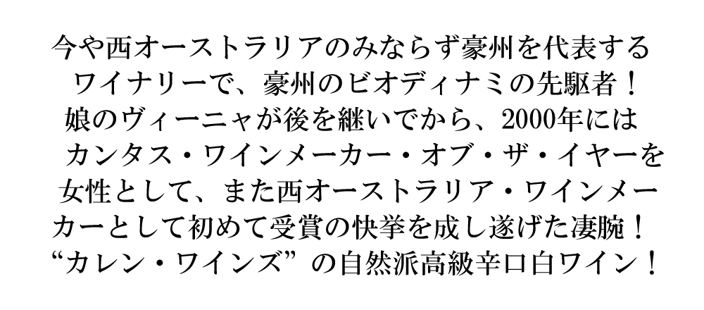 現在は、ローズワーシー大学にてワイン醸造を学んだ娘のダイアナが後を継ぎ世界的ワインコンクールの審査員を勤めるなどワイン業界で多大な貢献をしながらオーガニックの自社畑におけるビオディナミによる葡萄栽培を行い世界的に高い評価を博しています。2000年にはカンタスワインメーカーオブザイヤーを女性として、又西オーストラリアワインメーカーとして初めて受賞をしています。