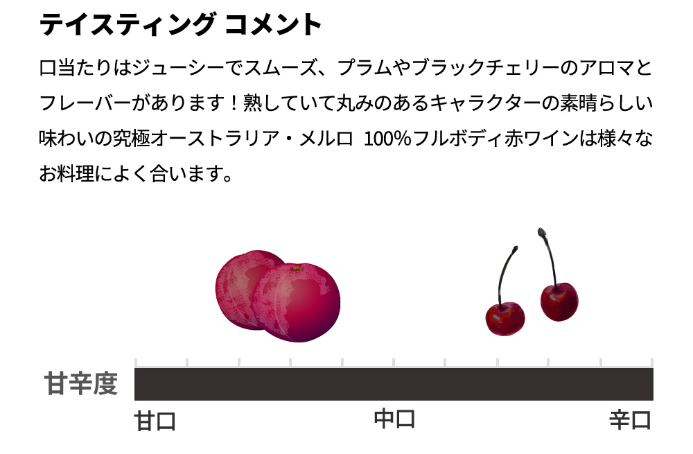 地中海性と海洋性気候のコンビネーションによって、力強さとリッチな味わいを持ち、それでいて柔らかくエレガントなスタイルに仕上がっています!口当たりはジューシーでスムーズ、プラムやブラックチェリーのアロマとフレーバーがあります!熟していて丸みのあるキャラクターの素晴らしい味わいの究極オーストラリア・メルロ100%フルボディ赤ワインは様々なお料理によく合います。