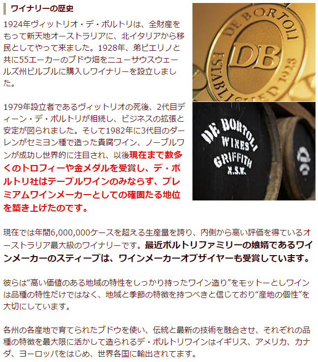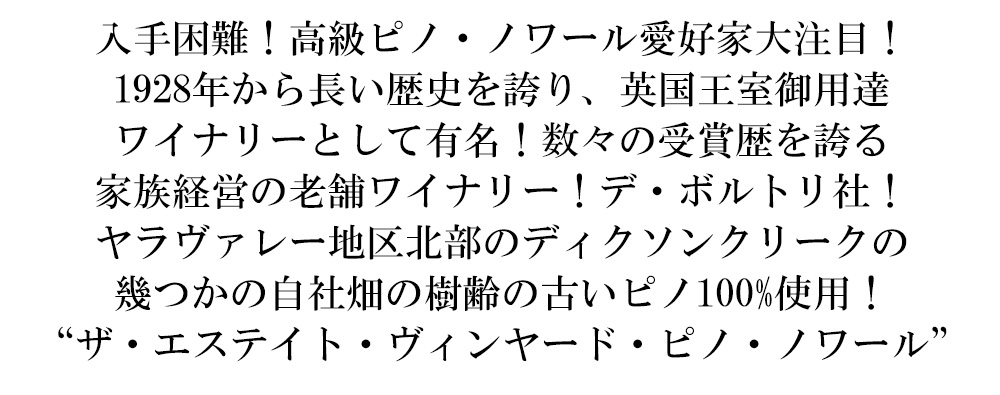 今までに3度、カンパニー・オブ・ザ・イヤーに選ばれ、オーストラリアのロバート・パーカーと呼ばれるジェームス・ハリディが監修する「ワインコンパニオン2013」では最高5つ星評価のワイナリーとして紹介されているオーストラリアトップ5ワイナリーに名をつらねる“デ・ボルトリ社”のヤラヴァレー産の厳選ピノ・ノワールが遂に極少量入荷!
