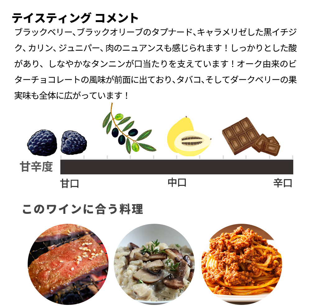 艶、輝き、光沢があり、ブラックベリー、ブラックオリーブのタプナード、キャラメリゼした黒イチジク、カリン、ジュニパー、肉のニュアンスも感じられます!しっかりとした酸があり、しなやかなタンニンが口当たりを支えています!オーク由来のビターチョコレートの風味が前面に出ており、タバコ、そしてダークベリーの果実味も全体に広がっています!
