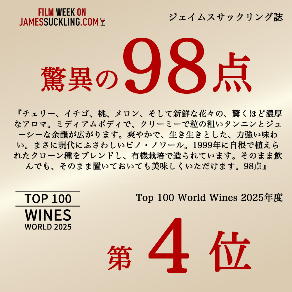 ジェイムスサックリング驚異の98点& ”Top 100 World Wines 2025年度”第4位獲得!大絶賛コメントは『チェリー、イチゴ、桃、メロン、そして新鮮な花々の、驚くほど濃厚なアロマ。ミディアムボディで、クリーミーで粒の粗いタンニンとジューシーな余韻が広がります。爽やかで、生き生きとした、力強い味わい。まさに現代にふさわしいピノ・ノワール。1999年に自根で植えられたクローン種をブレンドし、有機栽培で造られています。そのまま飲んでも、そのまま置いておいても美味しくいただけます。98点』と大注目!!