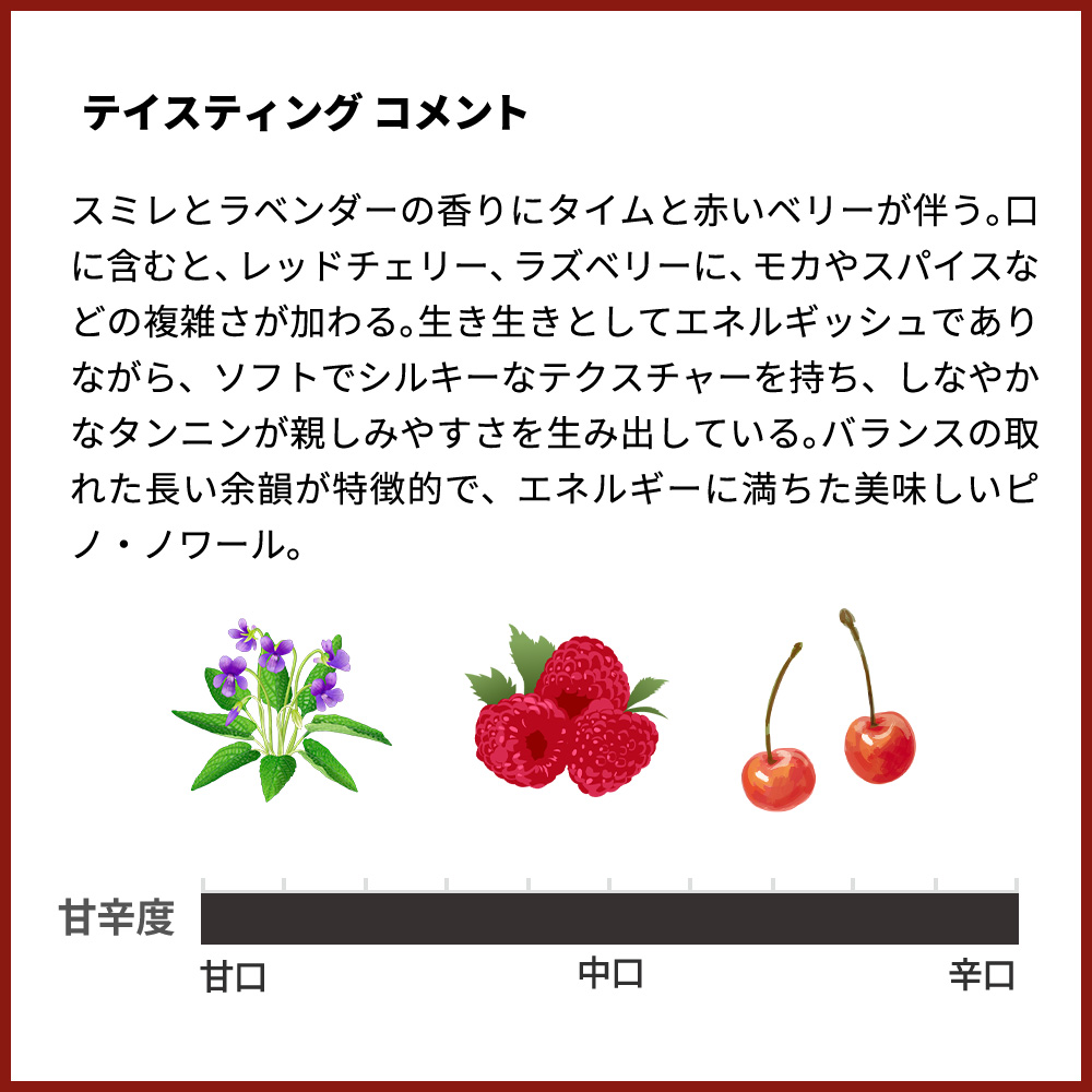 中程度の明るさのルビー色で、スミレとラベンダーの香りにタイムと赤いベリーが伴う。口に含むと、レッドチェリー、ラズベリーに、モカやスパイスなどの複雑さが加わる。生き生きとしてエネルギッシュでありながら、ソフトでシルキーなテクスチャーを持ち、しなやかなタンニンが親しみやすさを生み出している。バランスの取れた長い余韻が特徴的で、エネルギーに満ちた美味しいピノ・ノワール。