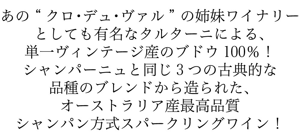 オーストラリアは両極端が混在する大陸です。タルターニは四つのユニークなブドウ畑から産出された高品質のブドウで、多様なスタイルのワインを造り出しています。そのワインはバランスが取れ、エレガントで複雑性があり、しかも品種の特徴やテロワール、また様々な醸造手法を表現しているものです。タルターニは素晴らしいビクトリア州産の白、赤そしてスパークリングワインを、ピレニーズ地区の自社畑から作り出しています。これらワインは若くても美味しく飲めますが、熟成に耐えるストラクチャとバランスを持っています。タルターニは、タスマニア州北東にあるパイパーズ・リヴァー地区にクローバー・ヒルおよび ララ・ガリーの2つのワイナリーも所有しています。また、最近ではビクトリア州でも世界的に有名なヒースコート地区(カンブリア紀の土壌で、シラーズが有名)からブドウを買い入れています。タルターニの素晴らしいスパークリングワイン、および世界一流の赤および白ワインは、長く華々しい歴史を持っています。そしてそれはワイナリーで働く一人ひとりの強い熱意と献身の賜物なのです。