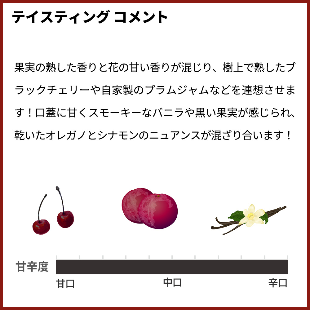果実の熟した香りと花の甘い香りが混じり、樹上で熟したブラックチェリーや自家製のプラムジャムなどを連想させます!口蓋に甘くスモーキーなバニラや黒い果実が感じられ、乾いたオレガノとシナモンのニュアンスが混ざり合います!