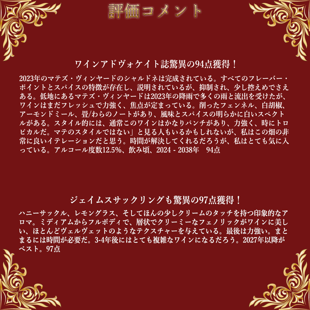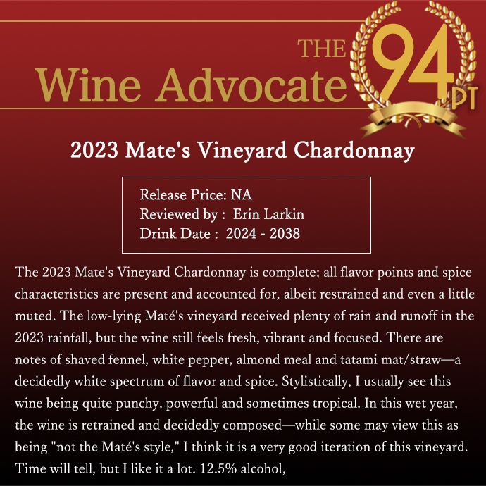 2023年ヴィンテージはアルコール度数が12.5%と軽めだったにもかかわらず、マテズ・ヴィンヤードの凝縮感と密度がこのワインで輝いています。