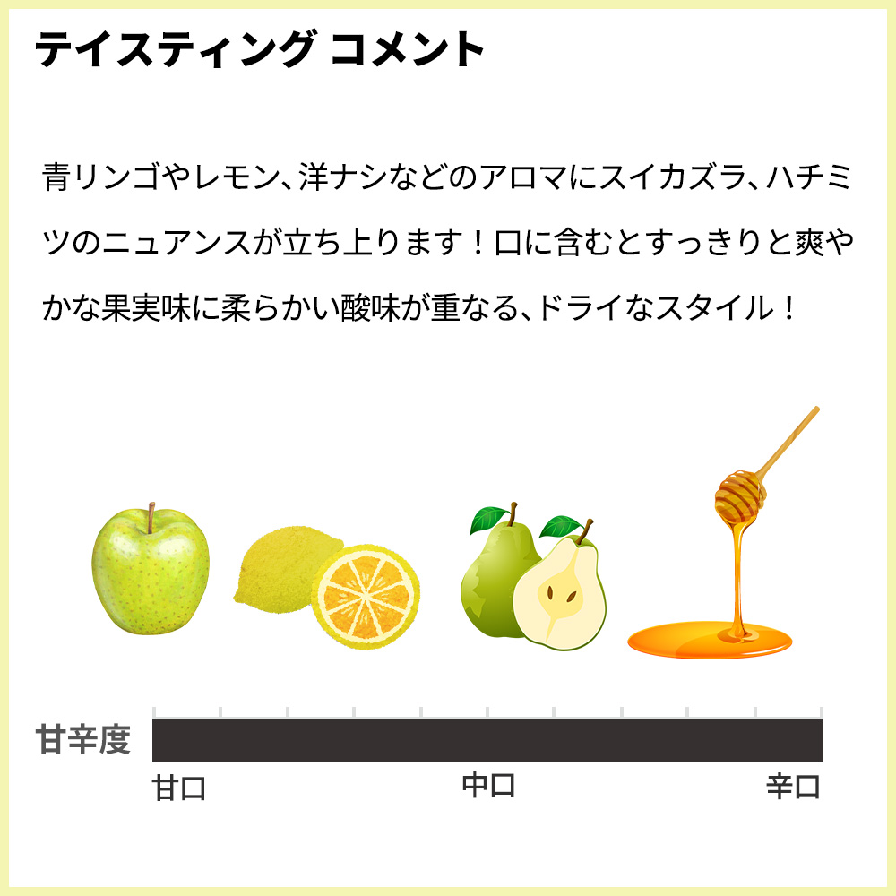 明るく透明感のあるレモンイエローの色調!青リンゴやレモン、洋ナシなどのアロマにスイカズラ、ハチミツのニュアンスが立ち上ります!口に含むとすっきりと爽やかな果実味に柔らかい酸味が重なる、ドライなスタイル!ナッツや白い花を纏った余韻が続く、優しい味わいの1本!