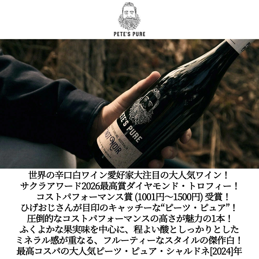 このピーツ・ピュア・シャルドネ[2024]年で見事、サクラワインアワード2026にて最高賞ダイヤモンド・トロフィー&ダブルゴールド、コストパフォーマンス賞 (1001円~1500円) 受賞!夏季の温暖で豊富な日照により、果実の味わいを豊かにするテロワールからの樹齢15年~20年の厳選シャルドネ100%使用!温度管理されたステンレスタンクにて発酵され、清澄には動物由来の成分を不使用で造られる辛口白ワイン!