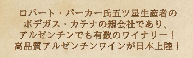 | ■ワインについて | ロバート・パーカー氏五ツ星生産者のボデガス・カテナの親会社であり、アルゼンチンでも有数のワイナリー、ボデガス・エスメラルダ!大人気ワインシリーズ“ティリア”が日本上陸!ブドウ畑で働く農夫たちが作業の合間に木陰で語らい憩う木「菩提樹」の名前が付けられたワイン!ワインスペクテイター誌、ワインエンスージアスト誌大注目!Laura Carenaの“Vino Argentino”では非常に詳しく大注目!メンドーサの東と南のカベルネ・ソーヴィニヨン100%をフレンチオーク樽とアメリカンオーク樽で6ヶ月熟成。濃厚な紫色にルビー色のエッジ、熟した赤い果実の味わいと甘くスパイシーで、タバコのようなスモーキーなニュアンス。リッチでフルボディな味わいの辛口赤ワイン。とてもこのプライスとは思えない、完成度の高い素晴らしい味わい! |