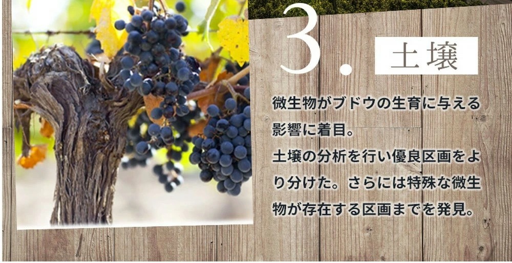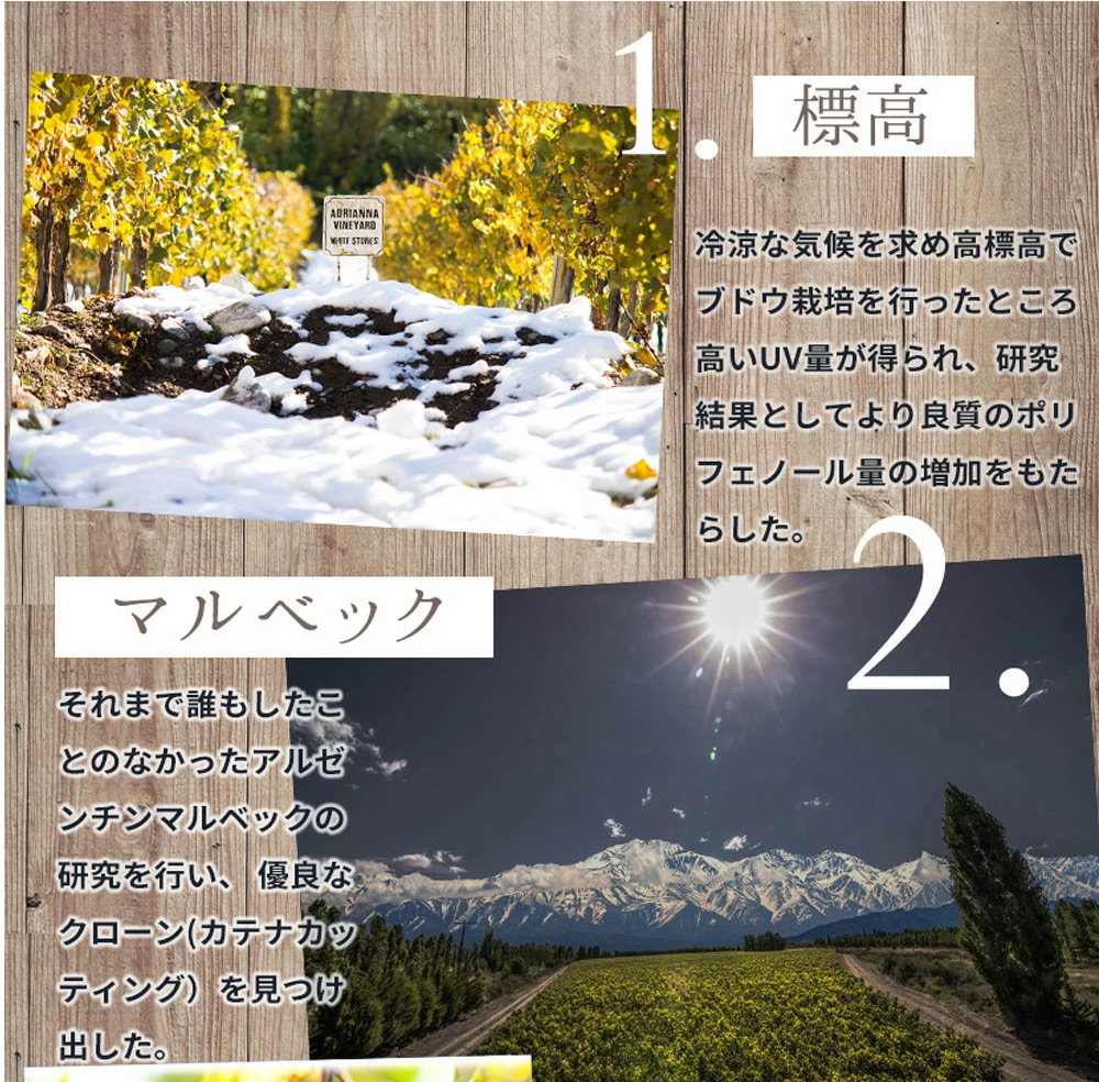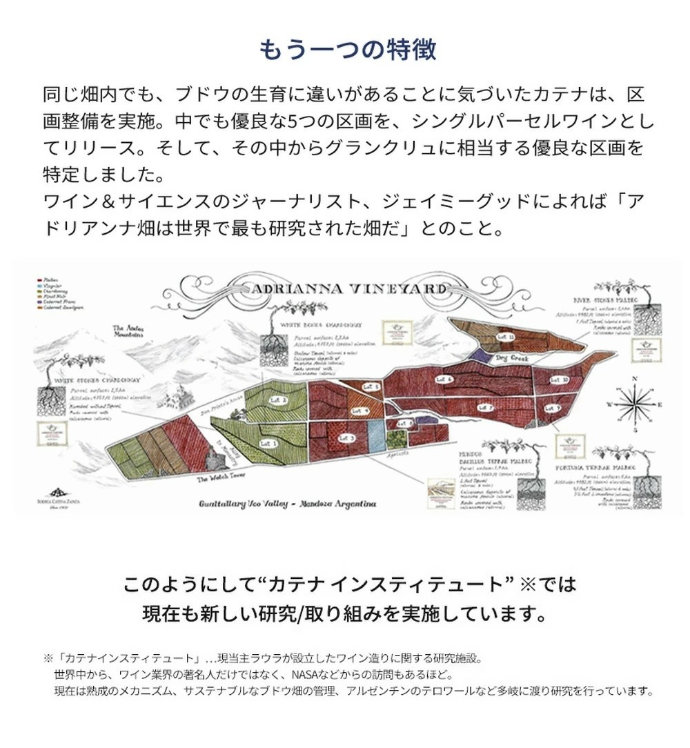 カテナ社は、アンデス山脈の麓の緩やかな傾斜地の標高の違う場所に5つの自家ブドウ畑を持ち、「適地的品種」のポリシーのもと、それぞれのブドウ畑の気候、土壌に最適のブドウ品種を栽培しています。また、同じブドウ品種を違う畑に植えることにより、糖度、酸味のバランスの違うさまざまな個性をもつブドウも栽培しています。これらのブドウで造ったワインを巧みにブレンドすることにより、複雑でデリケートな味わいのワインに仕上げています。