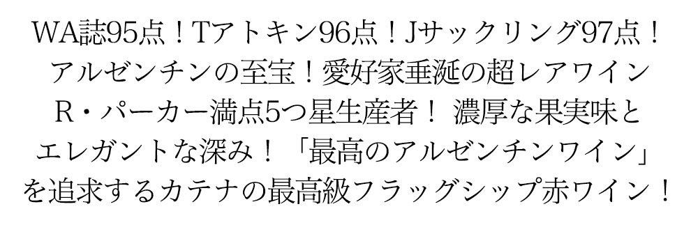 ニコラス カテナ サパータ 2017 蔵出し限定品 フレンチオーク樽18ヶ月 瓶熟24ヶ月 計48ヶ月 ノンフィルター 正規代理店輸入品 正規品 ■ぶどう品種:カベルネ・ソーヴィニヨン59%/マルベック33%/カベルネ・フラン8% ■発酵・熟成:天然酵母100%でフレンチオーク樽100%の225~500L樽で100%発酵さらにフレンチオーク樽100%(新樽80%)で驚異の18ヶ月熟成。しかも24ヶ月の瓶内熟成の計42ヶ月 カテナ家所有の3つの畑からの210区画に選別されたパーセルからのカベルネ・ソーヴィニヨン59%に、マルベック33%、カベルネ・フラン8%を天然酵母100%でフレンチオーク樽100%の225~500L樽で100%発酵さらにフレンチオーク樽100%(新樽80%)で驚異の18ヶ月熟成!しかも24ヶ月の瓶内熟成!の計42ヶ月と言う、気が遠くなる歳月を経て、ノンフィルター&ノンファイニングでようやくリリース!ブラックベリーのピューレとモカのノートにブラックオリーブのニュアンス、そしてスパイスケーキの長いフィニッシュ!
