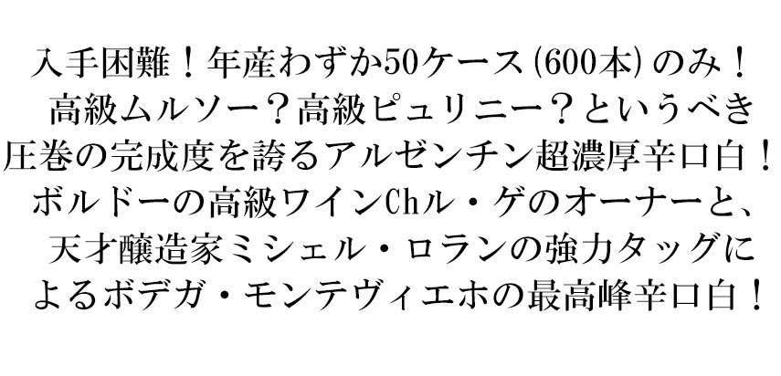 ボデガ・モンテヴィエホは、アルゼンチンのメンドーサから約60kmのヴィスタ・フローレス地区、標高1500mという高地トゥヌヤンに位置する南米最大規模のワイナリー。オーナーは、ポムロールのシャトー・ル・ゲやシャトー・モンヴィエルを所有するカトリーヌ・ペレ=ヴェルジェです。澄み切った空気、水、山。暑く乾燥した夏に寒さの厳しい冬と理想的な気候・・・カトリーヌは、アンデス山麓のこの素晴らしい土地でワイン造りに挑戦するため、アルゼンチンワインの可能性を信じていた友人の醸造コンサルタント、ミッシェル・ロランとともに土地探しをはじめました。1997年に古木のある大変よい区画を中心に300haの土地を入手してボデガ・モンテヴィエホを設立、世界に誇れる品質のワイン造りをスタートしました。ワインの醸造は、ペレ=ヴェルジェ社がボルドーに所有するシャトーのテクニカルチームが行なっています。アルゼンチンのスタッフはここでフランスのワイン造りのノウハウを学び、フランスのスタッフはブドウの栽培を通してテロワールを学ぶことで、文化の交流も深めています。