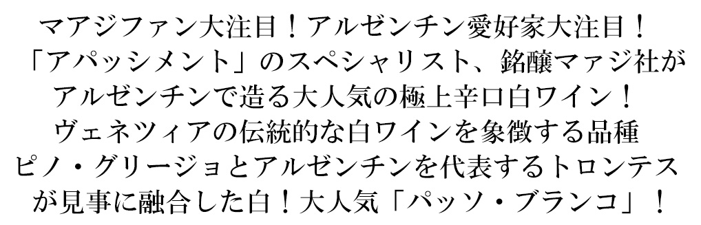 名門マァジ社がアルゼンチンで造るパッソ・ブランコが遂に限定入荷!マグロや甲殻類など香りがしっかりとした魚や鶏肉、グリルした野菜、オリエンタル料理と相性抜群!