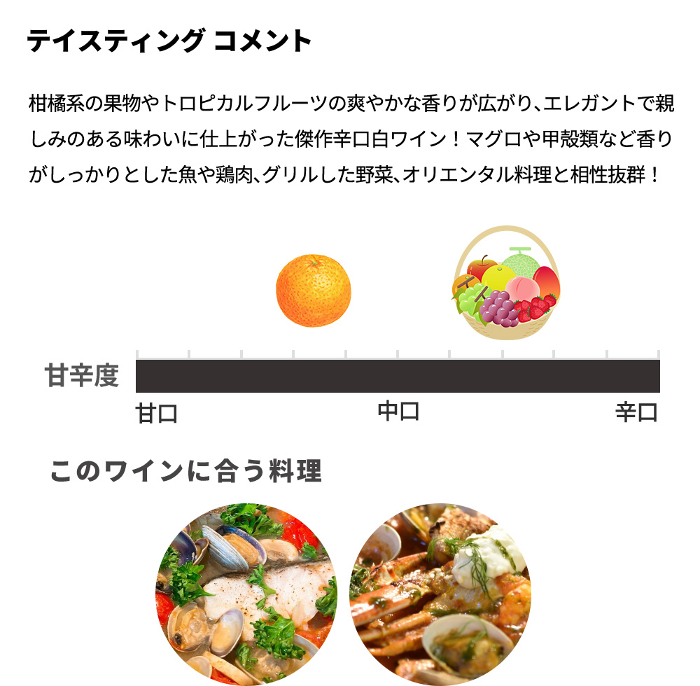 柑橘系の果物やトロピカルフルーツの爽やかな香りが広がり、エレガントで親しみのある味わいに仕上がった傑作辛口白ワイン!