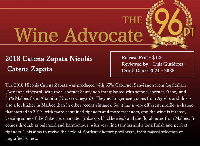 この2018年でワインアドヴォケイト誌驚異の96点でコメントは「2017年から始まった変化である、より熟した果実味を含み、よりフレッシュで、カベルネの特徴(タバコ、ブラックベリー)とマルベックのフローラルなノートを保ちつつ、凝縮感のあるワインに仕上がっている。バランスが取れていて調和がとれており、非常に繊細なタンニンと長い余韻、完璧な熟成感がある。このワインはフィロキセラ以前のボルドーのスタイルを復活させることを目的としている。」と大注目!