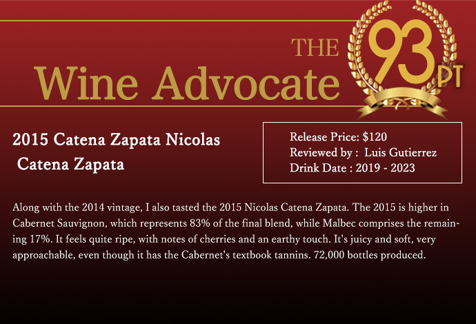 ワインアドヴォケイト93点で「2015年はカベルネ・ソーヴィニヨンの比率が高く、最終的なブレンドの83%を占め、マルベックは残りの17%を占める。かなり熟しており、チェリーの香りと土っぽいタッチが感じられる。カベルネの教科書的なタンニンを持ちながらも、ジューシーで柔らかく、とても親しみやすい。」!