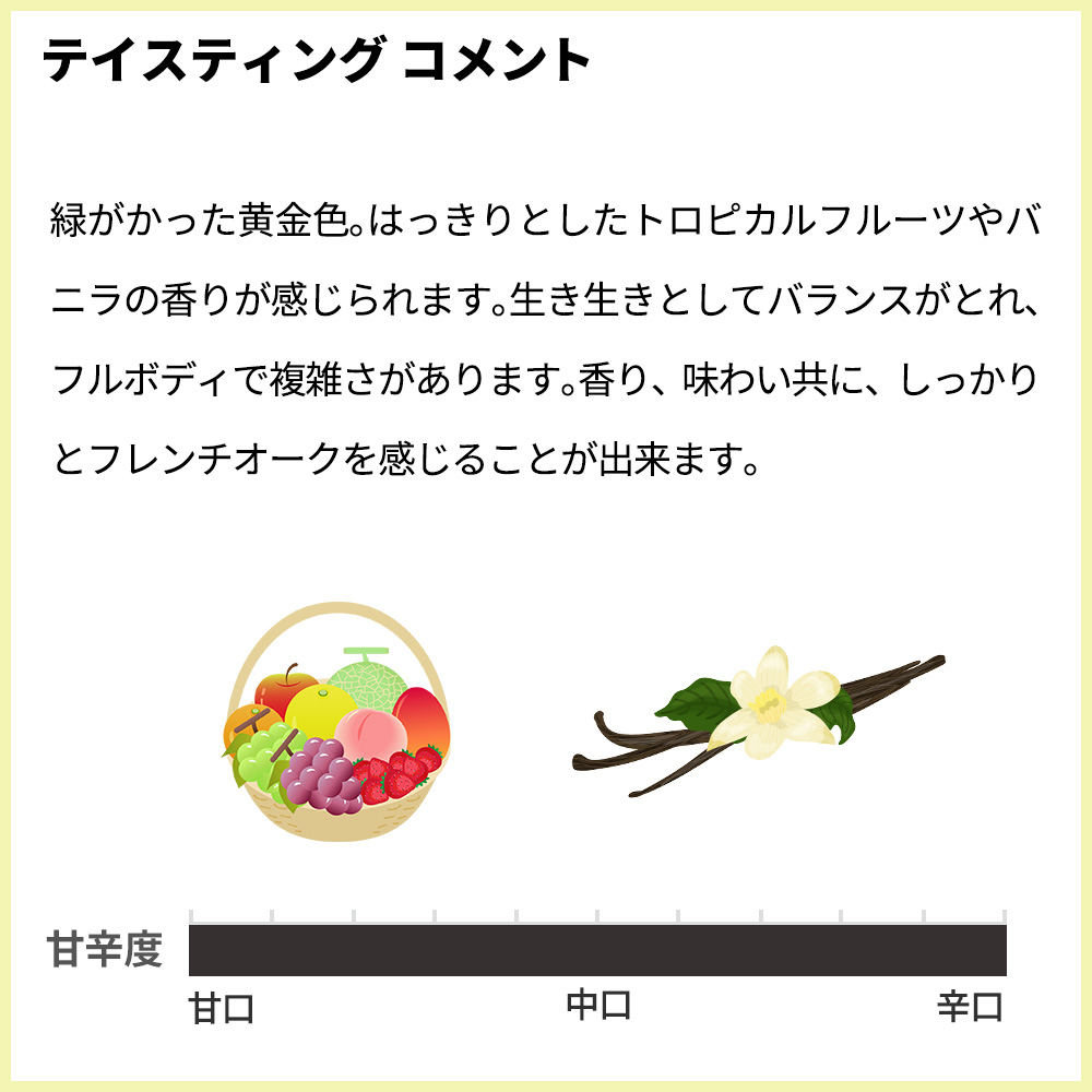 緑がかった黄金色。はっきりとしたトロピカルフルーツやバニラの香りが感じられます。生き生きとしてバランスがとれ、フルボディで複雑さがあります。香り、味わい共に、しっかりとフレンチオークを感じることが出来ます。