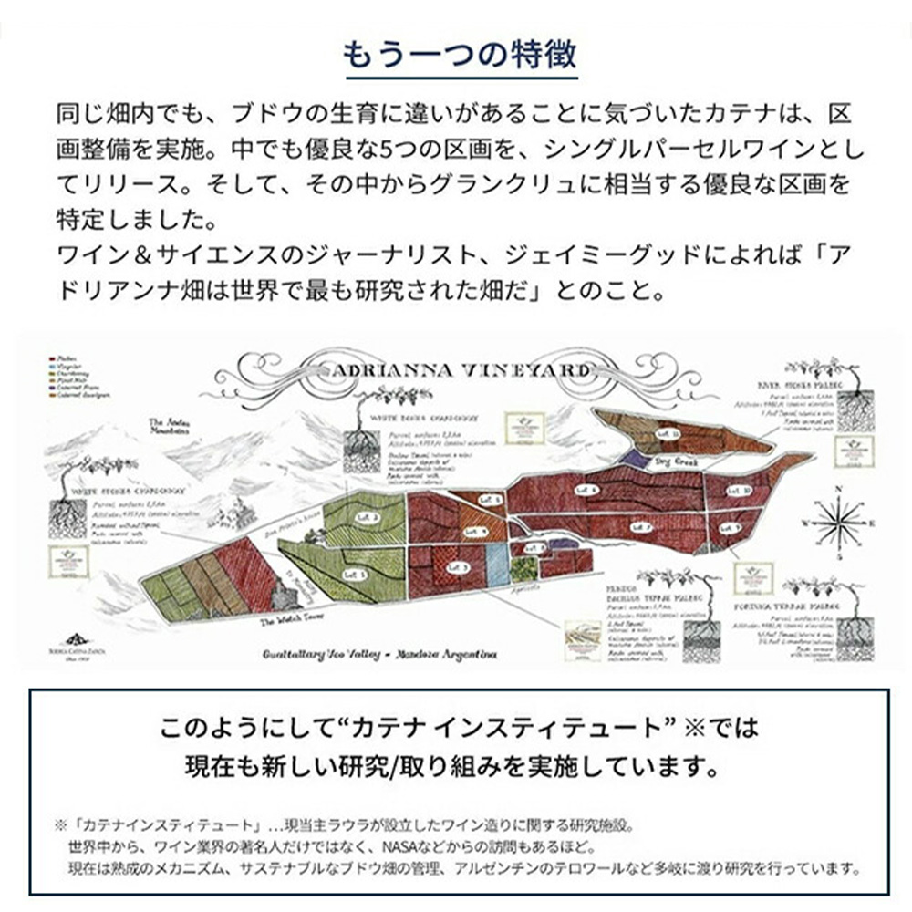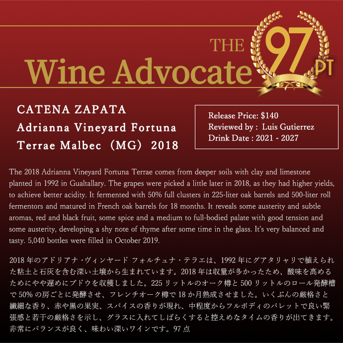 この[2018]年のアドリアンナ・ヴィンヤード・フォルトゥーナ・テラエ・マルベックで、ワインアドヴォケイト誌驚異の97点!絶賛コメントは『2018年のアドリアナ・ヴィンヤード フォルチュナ・テラエは、1992年にグアタリャリで植えられた粘土と石灰を含む深い土壌から生まれています。2018年は収量が多かったため、酸味を高めるためにやや遅めにブドウを収穫しました。225リットルのオーク樽と500リットルのロール発酵槽で50%の房ごとに発酵させ、フレンチオーク樽で18か月熟成させました。いくぶんの厳格さと繊細な香り、赤や黒の果実、スパイスの香りが現れ、中程度からフルボディのパレットで良い緊張感と若干の厳格さを示し、グラスに入れてしばらくすると控えめなタイムの香りが出てきます。非常にバランスが良く、味わい深いワインです。97点』と大注目!