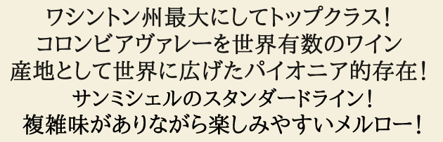 シャトー・サン・ミッシェル コンロンビアヴァレー・メルロー 2021年約16ヶ月間フレンチとアメリカンオーク樽(新樽比率約30%)熟成。ブラックチェリーや革、スパイスなど複雑で豊かなアロマ、ソフトでたっぷりしたタンニン、滑らかで長い余韻を持ちます。