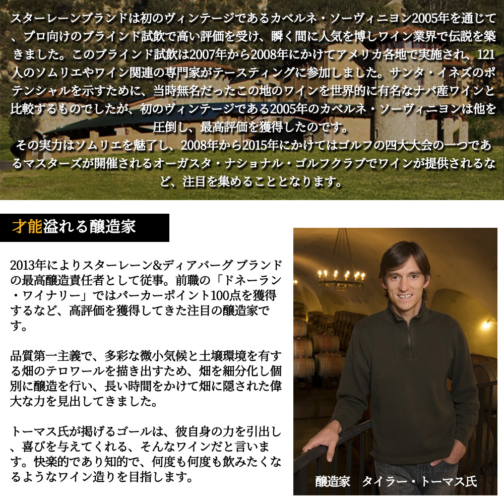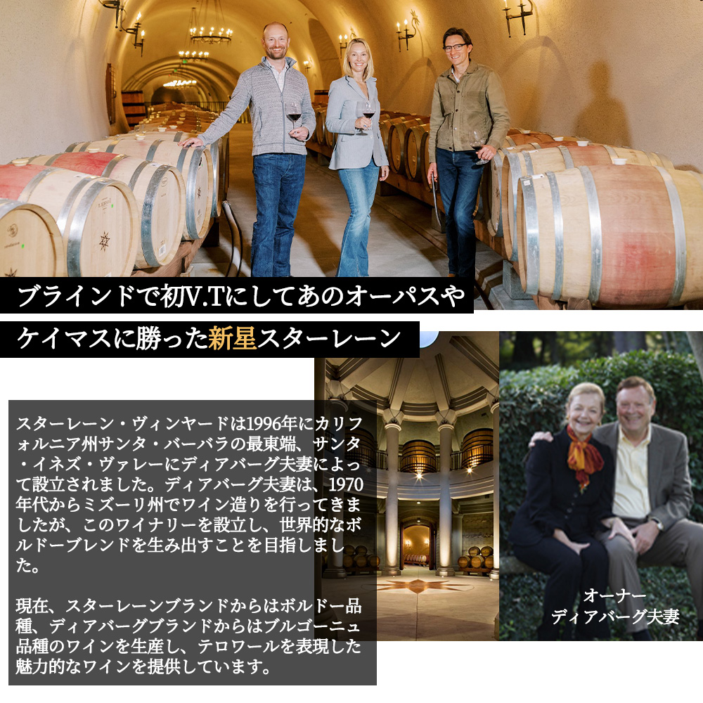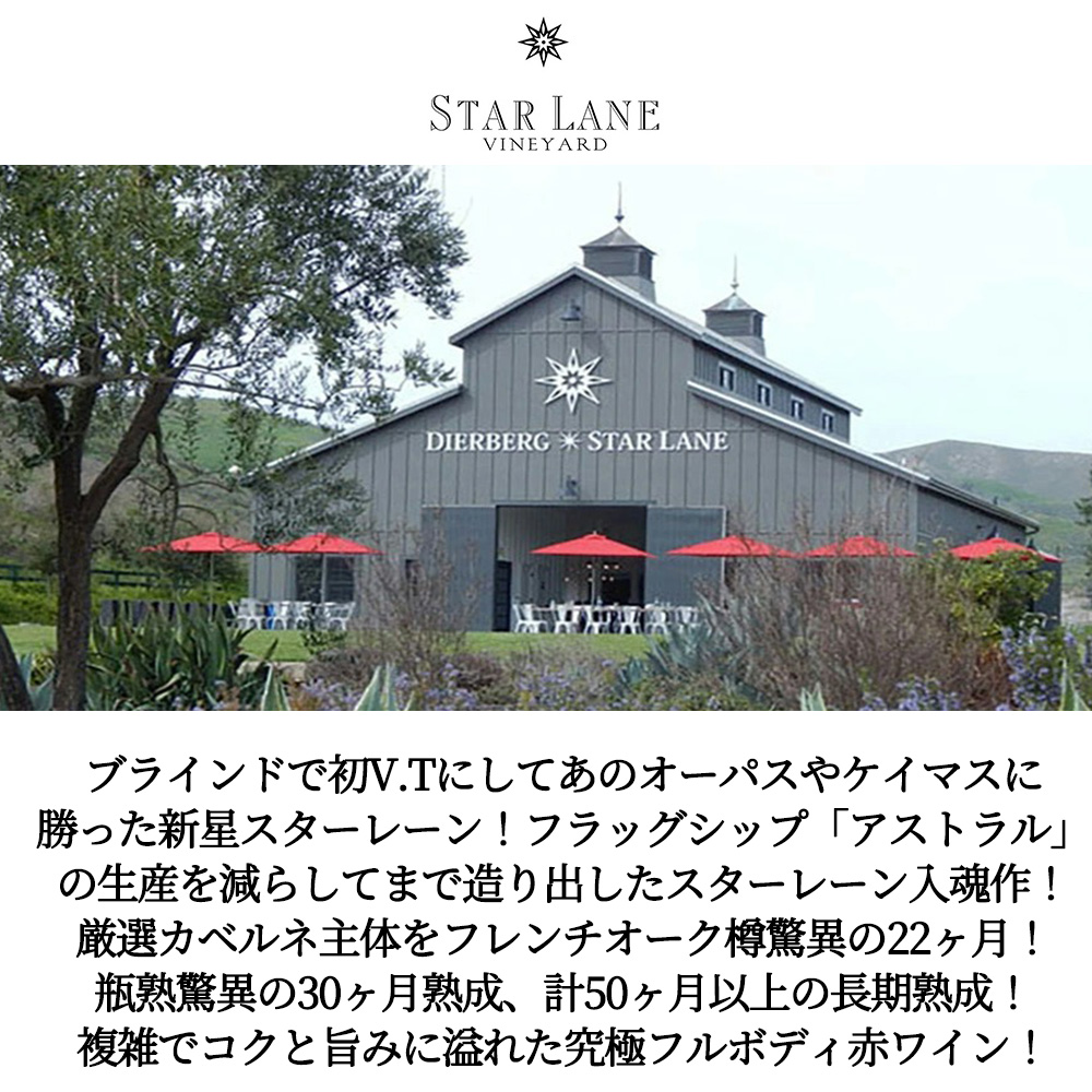 スターレーンのフラッグシップ“アストラル”の生産量を減らしてまで造り出したかった入魂の一本がこの特別キュヴェワイン!ディアブロ土壌、粘土ローム質、シルトローム質土壌からのカベルネ・ソーヴィニヨン77%、カベルネ・フラン12%、プティ・ヴェルド6%、メルロー5%を発酵は天然酵母にてステンレスタンク醗酵 (オープントップと密封式タンクの併用) 、マセレーション2-3週間!しかもフレンチオーク樽100%で、しかも驚異の22ヶ月熟成 (新樽比率30%) !しかも瓶熟驚異の30ヶ月熟成、計50ヶ月以上の熟成を経て造られる究極フルボディ辛口赤ワイン!