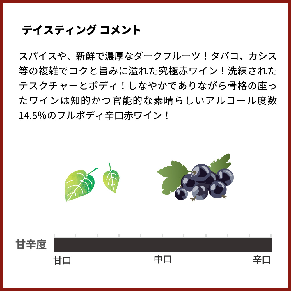 スパイスや、新鮮で濃厚なダークフルーツ!タバコ、カシス等の複雑でコクと旨みに溢れた究極赤ワイン!洗練されたテスクチャーとボディ!しなやかでありながら骨格の座ったワインは知的かつ官能的な素晴らしいアルコール度数14.5%のフルボディ辛口赤ワイン!が限定で極少量入荷!
