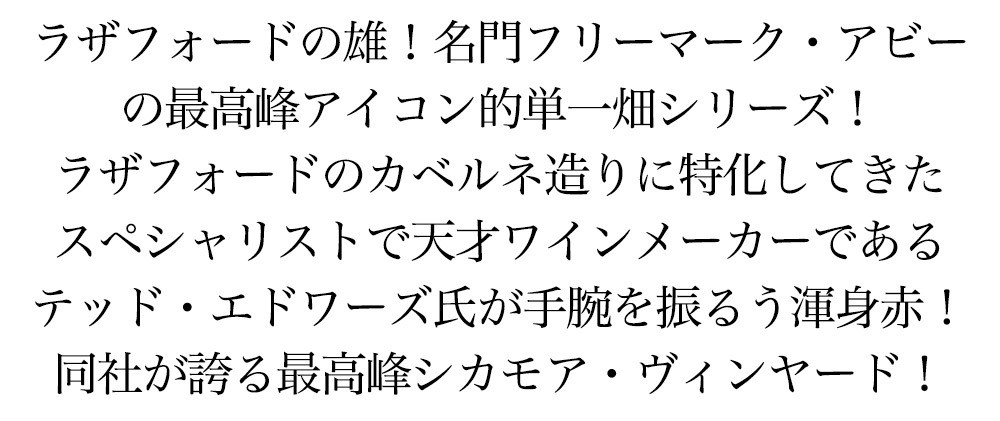 フリーマーク アビー シカモア ヴィンヤード カベルネ ソーヴィニョン 2015年 ■葡萄品種:カベルネ・ソーヴィニヨン88%/プティ・ヴェルド4%/カベルネ・フラン4%/メルロー4% 豊かな粘土質ローム層土壌からのカベルネ・ソーヴィニヨン88%、プティ・ヴェルド4%、カベルネ・フラン4%、メルロー4%を24-31度で8-10日間発酵! フレンチオーク(新樽65-70%)で24ヶ月熟成で造られる究極フルボディ辛口赤ワインです。 ずばりボッシェから南に約2Km、マヤカマスの向かいに位置する、より冷涼な約9.7haの畑シカモア・ヴィンヤード。 (小さなブドウの実がなるのが特徴で、しっかりと深く濃い色味と、黒カシスの香り、森の中のようなノートな複雑味がもたらされる。)