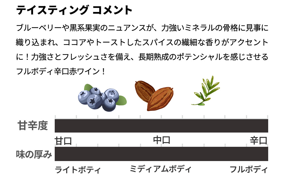 ■ぶどう品種:カベルネ ソーヴィニヨン92%/メルロ3%/プティ・ヴェルド2%/カベルネ・フラン2%/マルベック1%