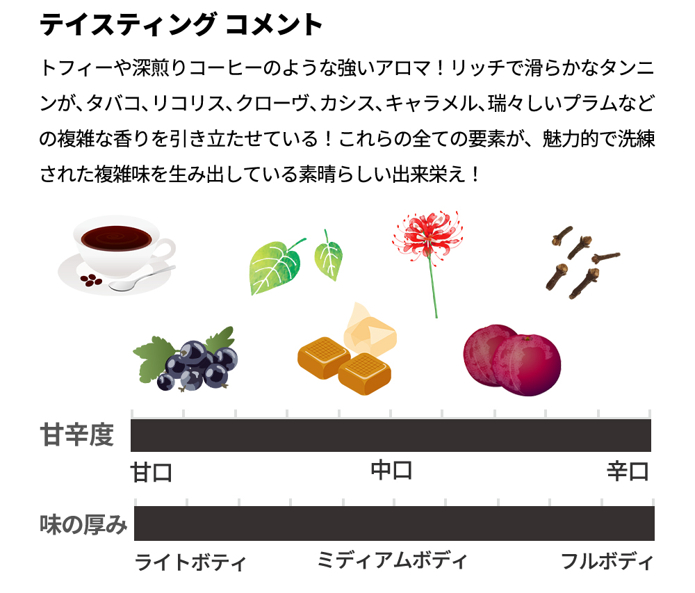 ■ぶどう品種: カベルネ・ソーヴィニョン92%、プティ・シラー4%、プティ・ヴェルド3%、シラー1%
